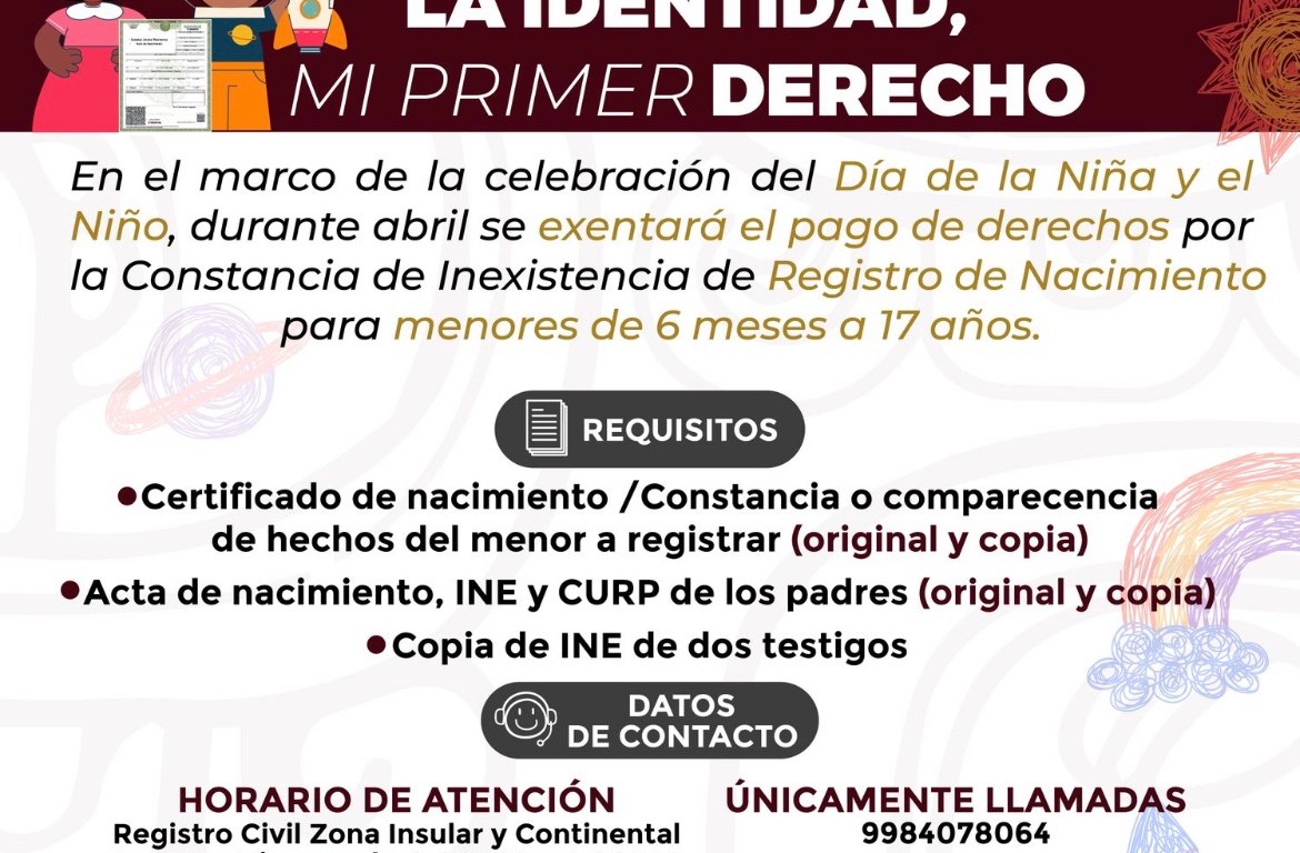 A través de esta iniciativa, durante todo el mes de abril se exentará el pago de derechos para la expedición de la Constancia de Inexistencia de Registro de Nacimiento, dirigida a menores de entre 6 meses y 17 años de edad.
