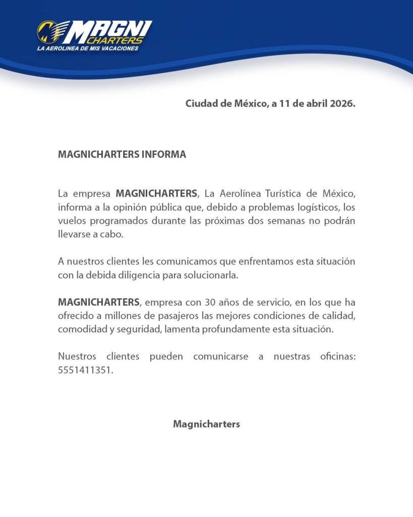 Magnicharters puso a disposición de los usuarios el número telefónico 55 5141 1351 para brindar información sobre los vuelos afectados.