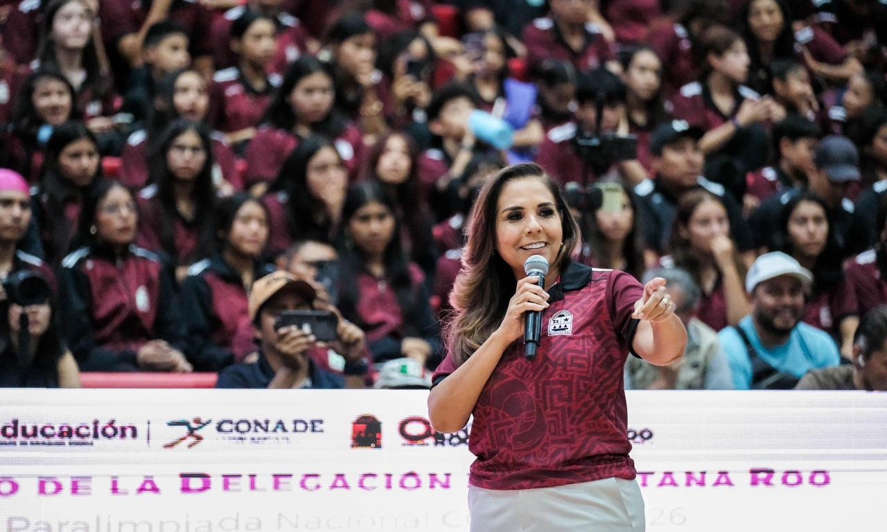 Cancún.- Al destacar que son un orgullo para Quintana Roo y con ello desearles todo el éxito para lo que serán unas próximas semanas de intensas competencias, la gobernadora Mara Lezama Espinosa abanderó a los más de 800 integrantes de la delegación deportiva de Quintana Roo, la más numerosa en la historia, entre ellos atletas, paratletas, entrenadores, delegados, jueces y staff, que participará en la Olimpiada y Paralimpiada Nacional CONADE 2026.
