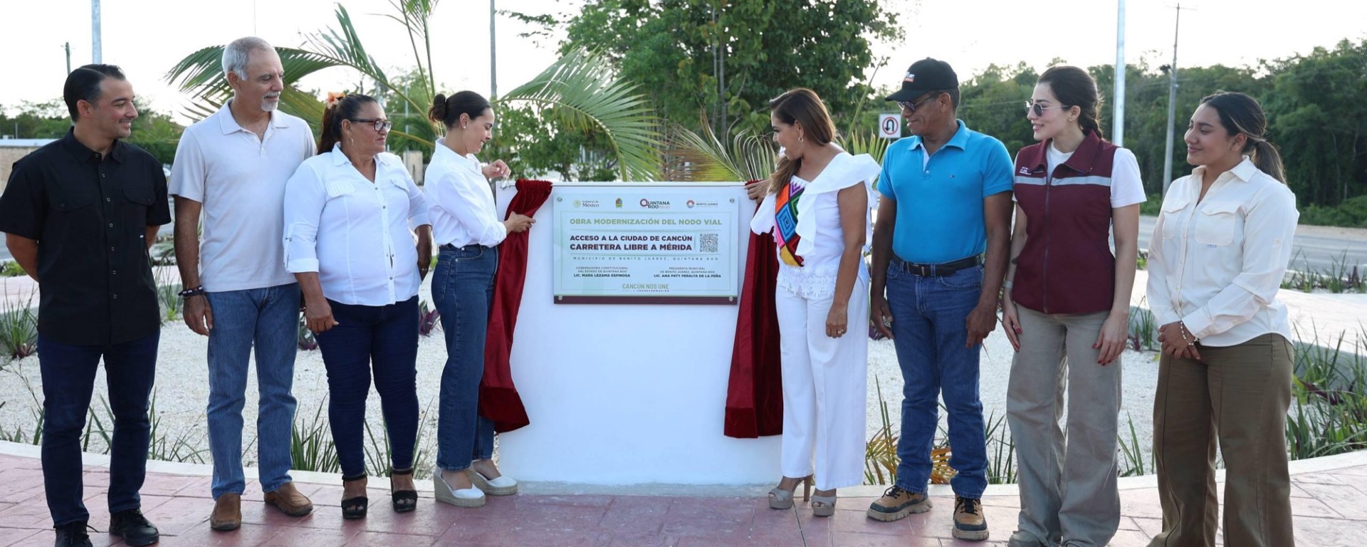 Cancún, Q. R., a 16 de abril de 2026.- Con la develación de una placa, la Presidenta Municipal, Ana Paty Peralta y la gobernadora del Estado, Mara Lezama Espinosa, inauguraron la renovada entrada a Cancún sobre la carretera libre a Mérida, una obra clave de 1.3 kilómetros que hoy permite transitar con mayor seguridad, rapidez y orden hacia la ciudad.