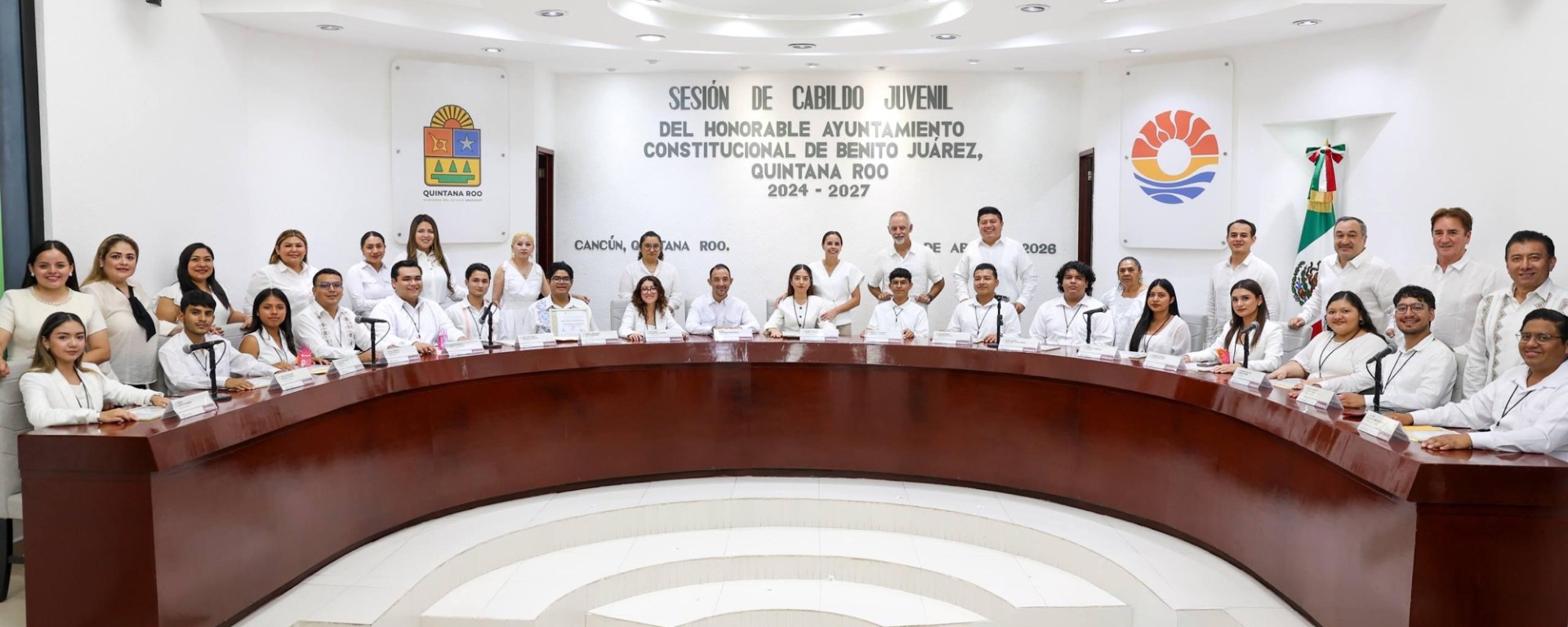 Cancún, Q. R., a 17 de abril de 2026.- La Presidenta Municipal, Ana Paty Peralta, atestiguó la realización de la Sesión de Cabildo Juvenil 2026, en la que 17 jóvenes cancunenses de entre 18 y 29 años de edad, expusieron sus iniciativas para mejorar y transformar la ciudad en cuatro rubros importantes: empleo, salud, cultura e inclusión.