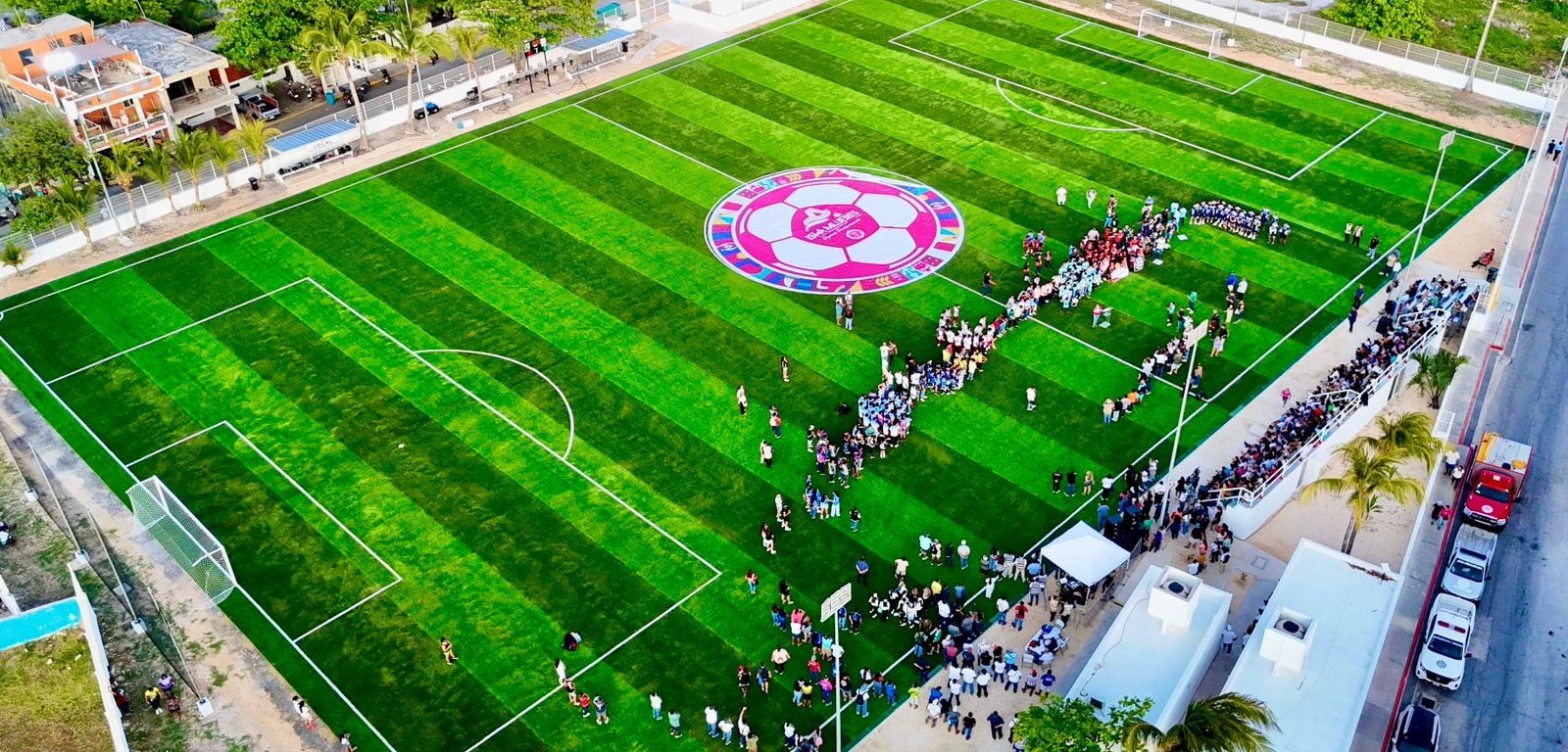 La nueva cancha cuenta con pasto sintético, vestidores, baños para jugadores y público en general, iluminación LED, tiendita y gradas, brindando a las y los deportistas un espacio seguro, moderno y adecuado para su desarrollo.